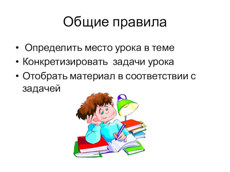 Общие правила Определить место урока в темеКонкретизировать задачи урокаОтобрать материал в соответствии с задачей