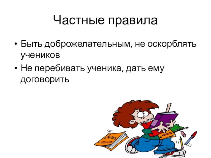 Частные правилаБыть доброжелательным, не оскорблять учениковНе перебивать ученика, дать ему договорить