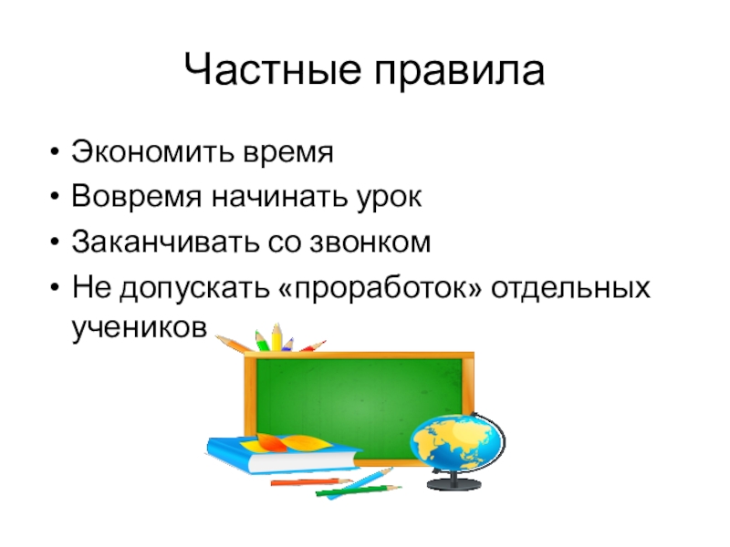 Частные правилаЭкономить времяВовремя начинать урокЗаканчивать со звонкомНе допускать «проработок» отдельных учеников