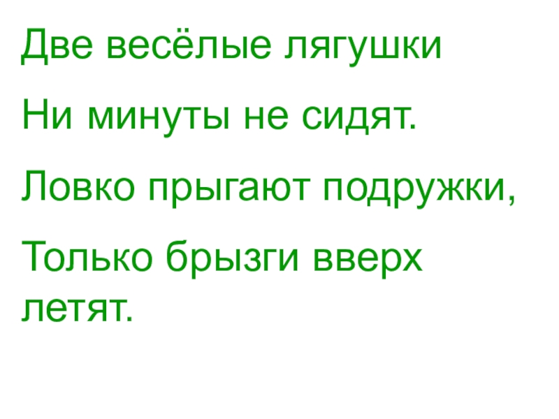 Две весёлые лягушкиНи минуты не сидят.Ловко прыгают подружки,Только брызги вверх летят.