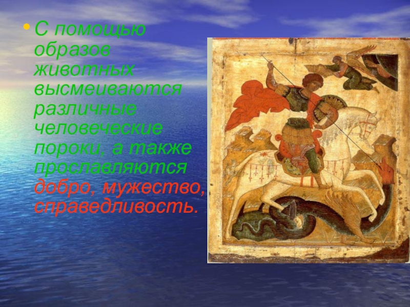 Слайд 4С помощью образов животных высмеиваются различные человеческие пороки, а также прославляются