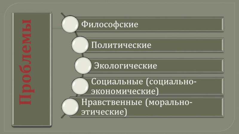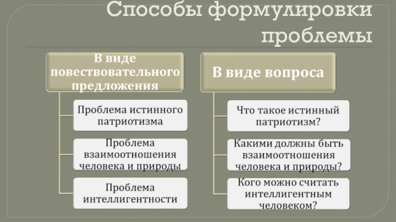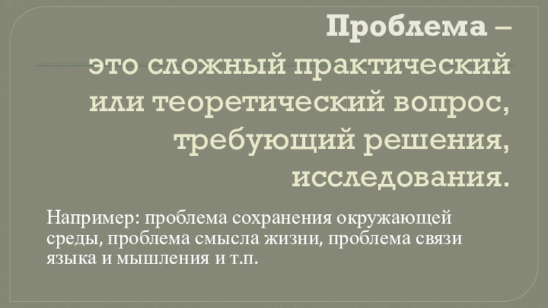 Например: проблема сохранения окружающей среды, проблема смысла жизни, проблема связи языка и мышления и т.п.