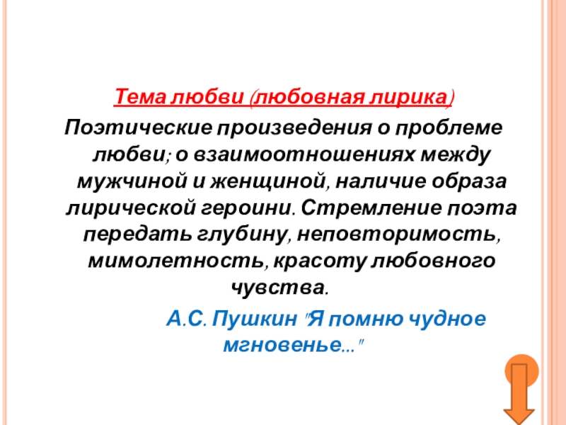 мужчиной и женщиной, наличие образа лирической героини. Стремление поэта передать глубину, неповторимость, мимолетность, красоту любовного чувства.