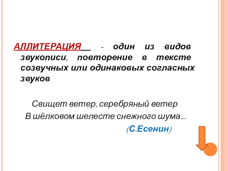 Слайд 28АЛЛИТЕРАЦИЯ - один из видов звукописи, повторение в тексте созвучных или