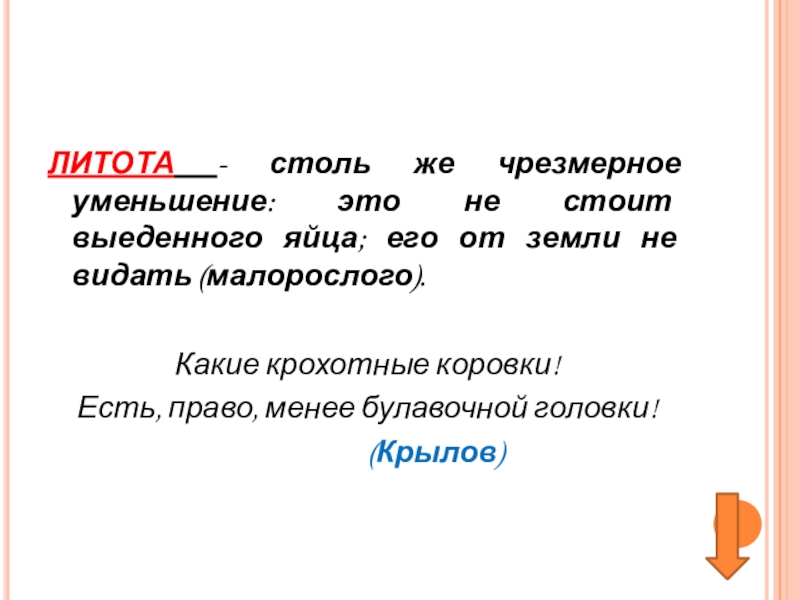 Слайд 23ЛИТОТА - столь же чрезмерное уменьшение: это не стоит выеденного яйца;