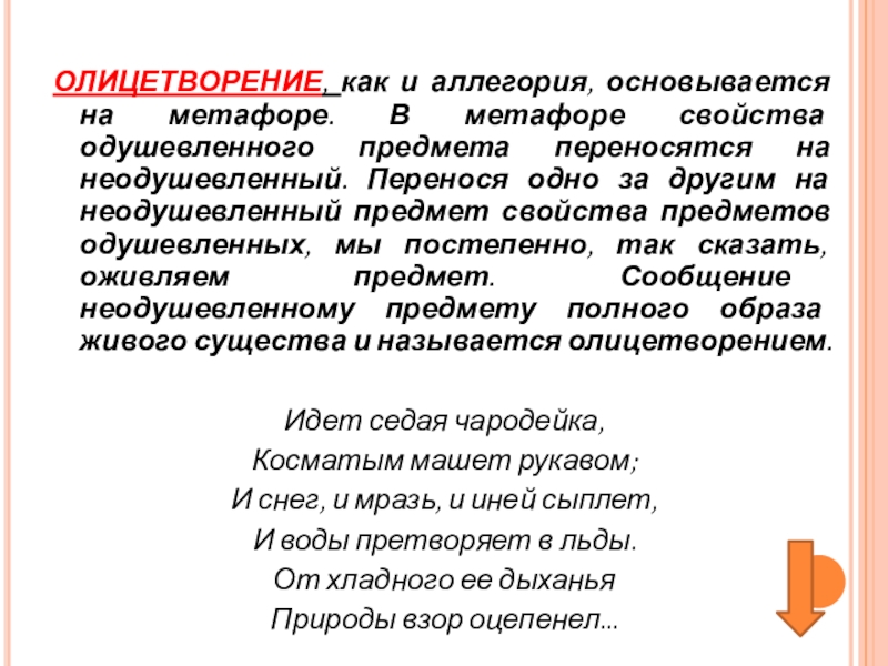 Слайд 24ОЛИЦЕТВОРЕНИЕ, как и аллегория, основывается на метафоре. В метафоре свойства одушевленного