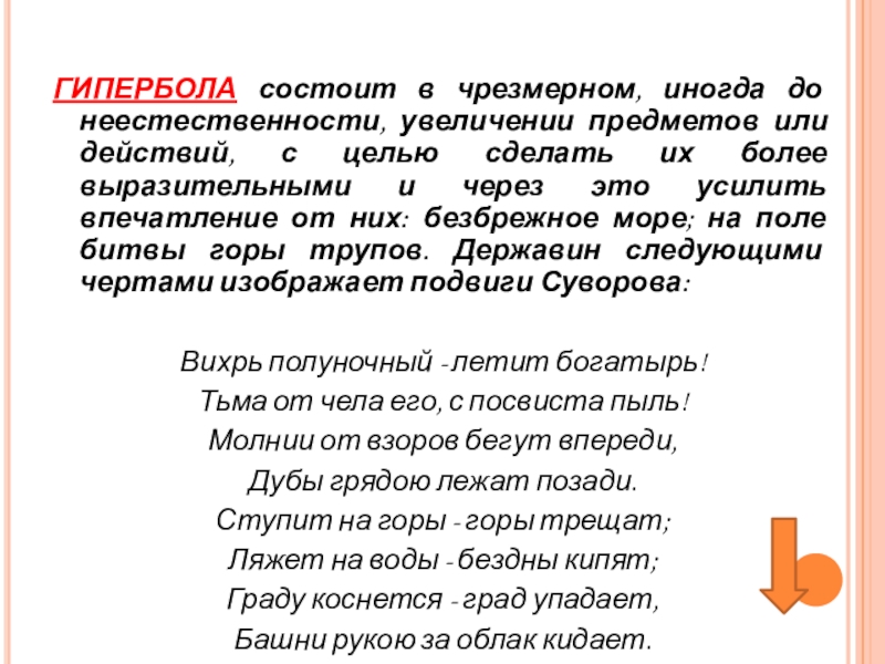 с целью сделать их более выразительными и через это усилить впечатление от них: безбрежное море; на поле битвы горы трупов. Державин следующими чертами изображает подвиги Суворова: