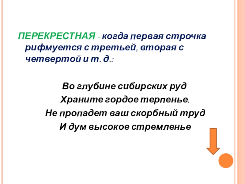 ПЕРЕКРЕСТНАЯ - когда первая строчка рифмуется с третьей, вторая с четвертой