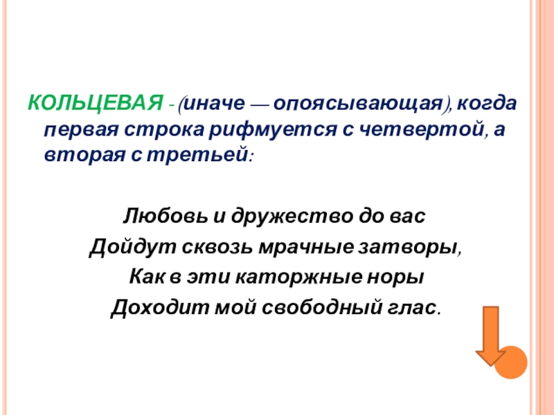КОЛЬЦЕВАЯ - (иначе — опоясывающая), когда первая строка рифмуется с четвертой,