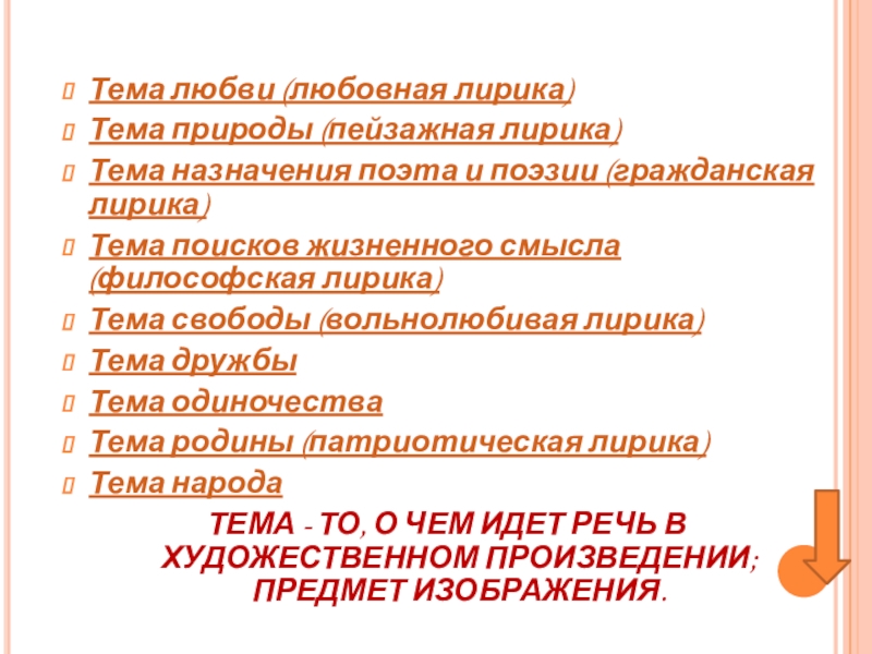 ТЕМА - ТО, О ЧЕМ ИДЕТ РЕЧЬ В ХУДОЖЕСТВЕННОМ ПРОИЗВЕДЕНИИ; ПРЕДМЕТ ИЗОБРАЖЕНИЯ.