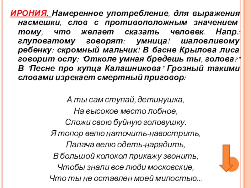 Слайд 21ИРОНИЯ. Намеренное употребление, для выражения насмешки, слов с противоположным значением тому,