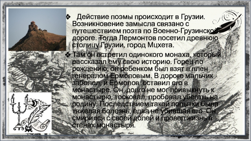 путешествием поэта по Военно-Грузинской дороге. Тогда Лермонтов посетил древнюю столицу Грузии, город Мцхета.