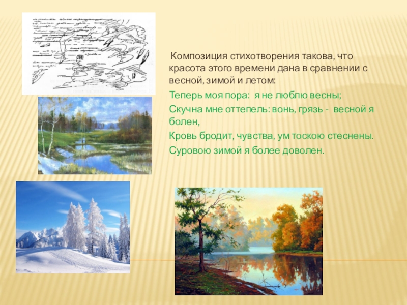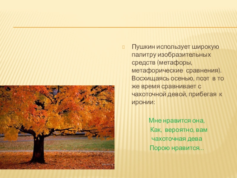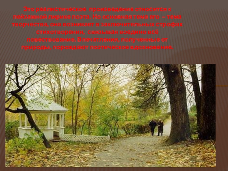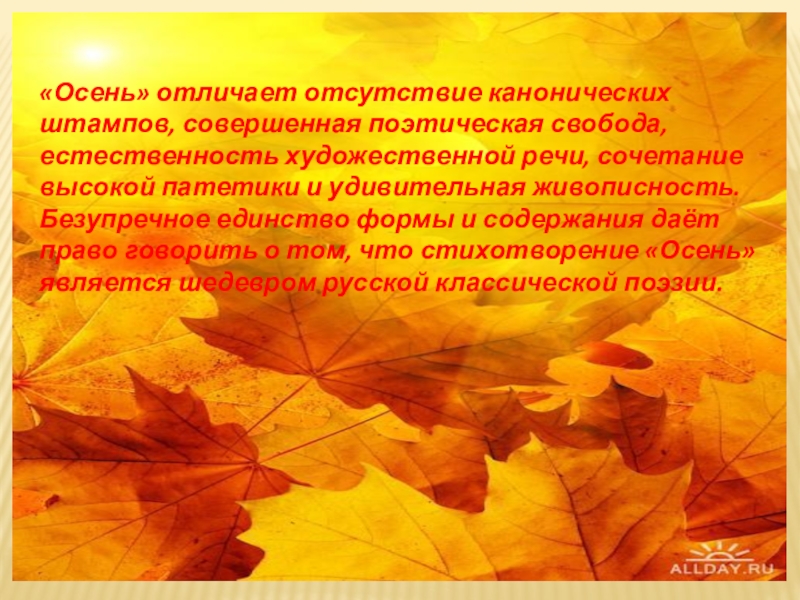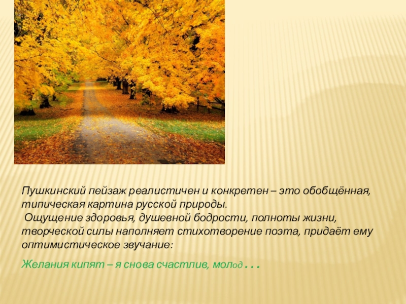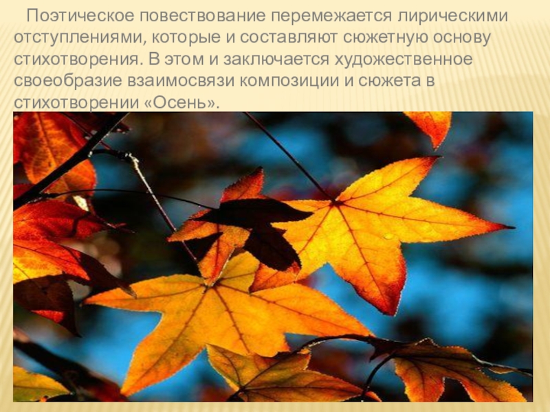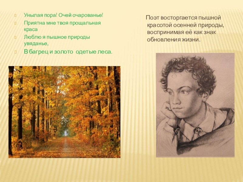 Поэт восторгается пышной красотой осенней природы, воспринимая её как знак обновления жизни.