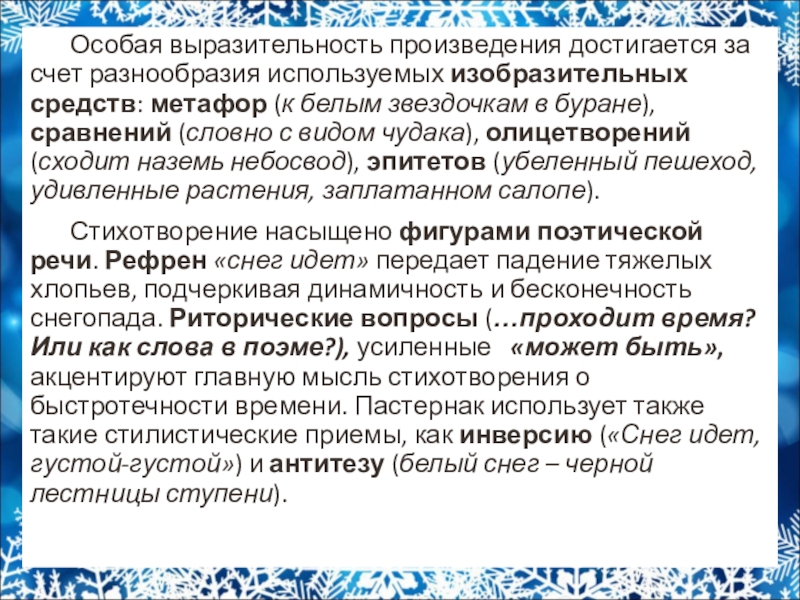 Стихотворение насыщено фигурами поэтической речи. Рефрен «снег идет» передает падение тяжелых хлопьев, подчеркивая динамичность и бесконечность снегопада. Риторические вопросы (…проходит время? Или как слова в поэме?), усиленные «может быть», акцентируют главную мысль стихотворения о быстротечности времени. Пастернак использует также такие стилистические приемы, как инверсию («Снег идет, густой-густой») и антитезу (белый снег – черной лестницы ступени).