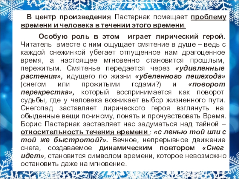 Особую роль в этом играет лирический герой. Читатель вместе с ним ощущает смятение в душе – ведь с каждой снежинкой убегает отпущенное нам драгоценное время, а настоящее мгновенно становится прошлым, пережитым. Смятенье передается через «удивленные растения», идущего по жизни «убеленного пешехода» (снегом или прожитыми годами?) и «поворот перекрестка», который воспринимается как поворот судьбы, где у человека возникает выбор жизненного пути. Снегопад заставляет лирического героя взглянуть на обыденные вещи по-иному, понять и прочувствовать Время. Борис Пастернак заставляет нас задуматься над тайной – относительность течения времени : «с ленью той или с той же быстротой?». Вечное, непрерывное движение снега, создаваемое динамическим повтором «Снег идет», становится символом времени, которое невозможно остановить даже на мгновение.
