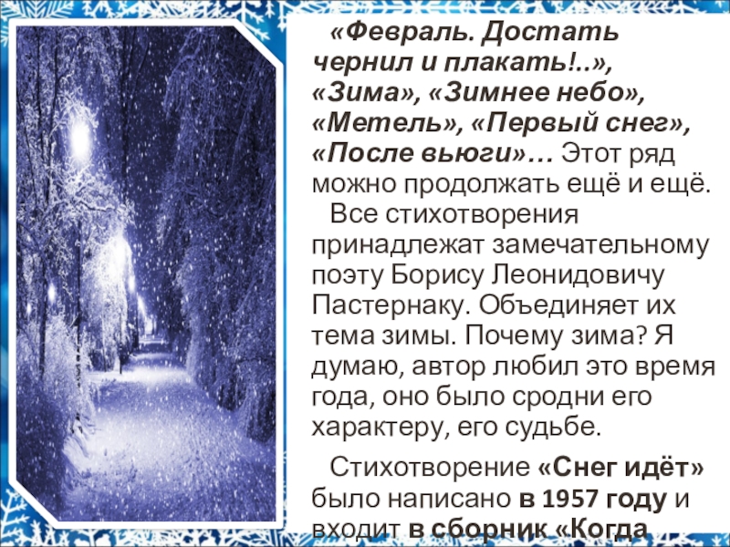 «После вьюги»… Этот ряд можно продолжать ещё и ещё. Все стихотворения принадлежат замечательному поэту Борису Леонидовичу Пастернаку. Объединяет их тема зимы. Почему зима? Я думаю, автор любил это время года, оно было сродни его характеру, его судьбе.