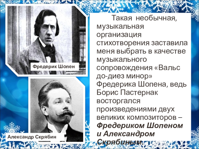 сопровождения «Вальс до-диез минор» Фредерика Шопена, ведь Борис Пастернак восторгался произведениями двух великих композиторов – Фредериком Шопеном и Александром Скрябиным.