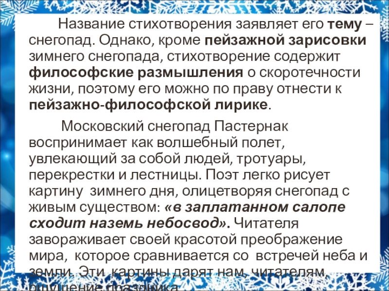 Московский снегопад Пастернак воспринимает как волшебный полет, увлекающий за собой людей, тротуары, перекрестки и лестницы. Поэт легко рисует картину зимнего дня, олицетворяя снегопад с живым существом: «в заплатанном салопе сходит наземь небосвод». Читателя завораживает своей красотой преображение мира, которое сравнивается со встречей неба и земли. Эти картины дарят нам, читателям, ощущение праздника.