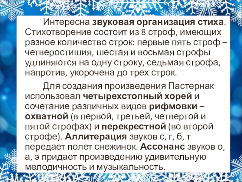 Для создания произведения Пастернак использовал четырехстопный хорей и сочетание различных видов рифмовки – охватной (в первой, третьей, четвертой и пятой строфах) и перекрестной (во второй строфе). Аллитерация звуков с, г, б, т передает полет снежинок. Ассонанс звуков о, а, э придает произведению удивительную мелодичность и музыкальность.