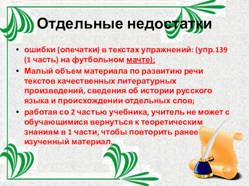 Малый объем материала по развитию речи текстов качественных литературных произведений, сведения об истории русского языка и происхождении отдельных слов;