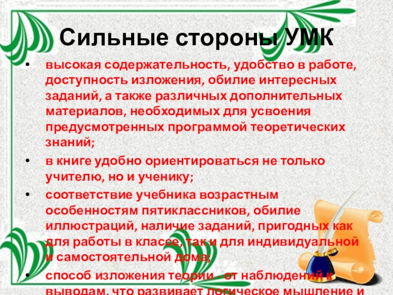соответствие учебника возрастным особенностям пятиклассников, обилие иллюстраций, наличие заданий, пригодных как для работы в классе, так и для индивидуальной и самостоятельной дома;