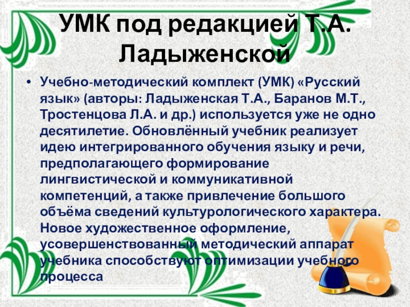 Т.А., Баранов М.Т., Тростенцова Л.А. и др.) используется уже не одно десятилетие. Обновлённый учебник реализует идею интегрированного обучения языку и речи, предполагающего формирование лингвистической и коммуникативной компетенций, а также привлечение большого объёма сведений культурологического характера. Новое художественное оформление, усовершенствованный методический аппарат учебника способствуют оптимизации учебного процесса