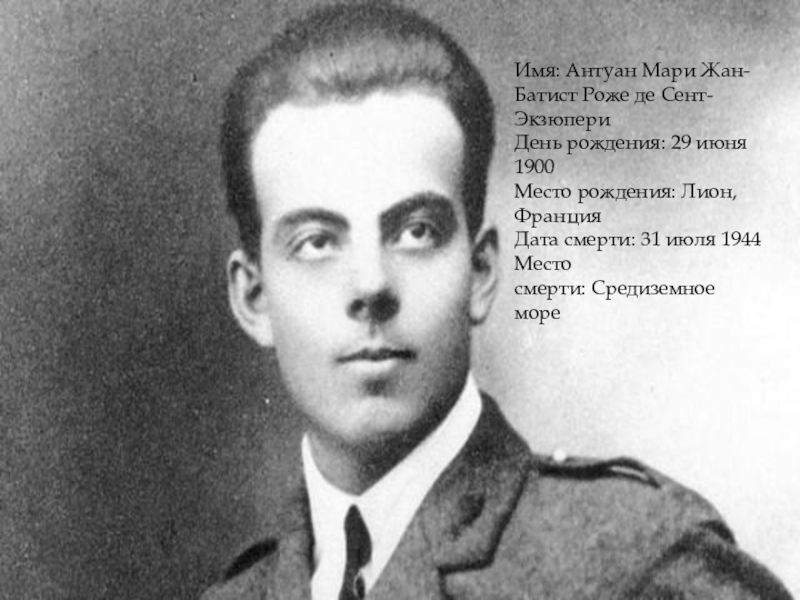 Слайд 2Имя: Антуан Мари Жан-Батист Роже де Сент-Экзюпери