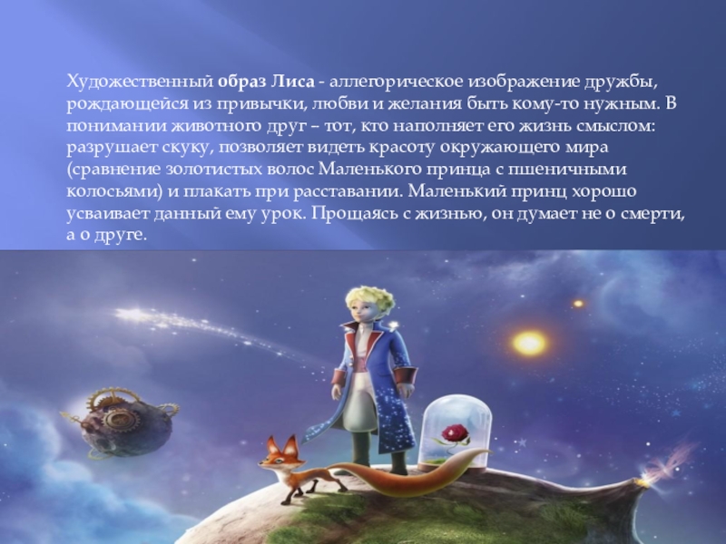 быть кому-то нужным. В понимании животного друг – тот, кто наполняет его жизнь смыслом: разрушает скуку, позволяет видеть красоту окружающего мира (сравнение золотистых волос Маленького принца с пшеничными колосьями) и плакать при расставании. Маленький принц хорошо усваивает данный ему урок. Прощаясь с жизнью, он думает не о смерти, а о друге.