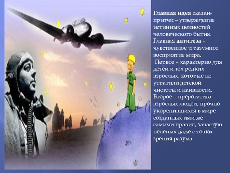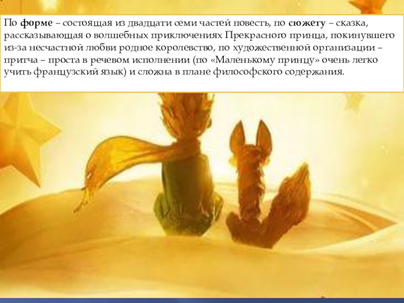 волшебных приключениях Прекрасного принца, покинувшего из-за несчастной любви родное королевство, по художественной организации – притча – проста в речевом исполнении (по «Маленькому принцу» очень легко учить французский язык) и сложна в плане философского содержания.