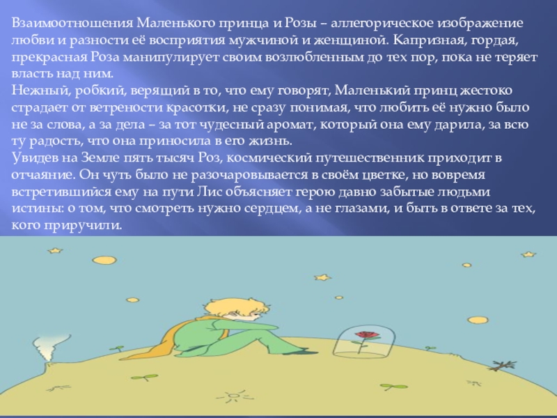 Слайд 7Взаимоотношения Маленького принца и Розы – аллегорическое изображение любви и разности