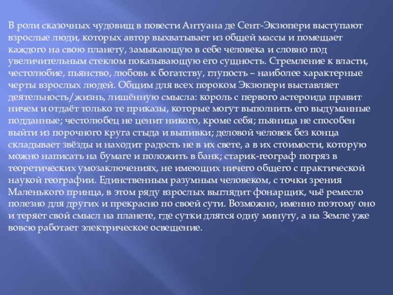 люди, которых автор выхватывает из общей массы и помещает каждого на свою планету, замыкающую в себе человека и словно под увеличительным стеклом показывающую его сущность. Стремление к власти, честолюбие, пьянство, любовь к богатству, глупость – наиболее характерные черты взрослых людей. Общим для всех пороком Экзюпери выставляет деятельность/жизнь, лишённую смысла: король с первого астероида правит ничем и отдаёт только те приказы, которые могут выполнить его выдуманные подданные; честолюбец не ценит никого, кроме себя; пьяница не способен выйти из порочного круга стыда и выпивки; деловой человек без конца складывает звёзды и находит радость не в их свете, а в их стоимости, которую можно написать на бумаге и положить в банк; старик-географ погряз в теоретических умозаключениях, не имеющих ничего общего с практической наукой географии. Единственным разумным человеком, с точки зрения Маленького принца, в этом ряду взрослых выглядит фонарщик, чьё ремесло полезно для других и прекрасно по своей сути. Возможно, именно поэтому оно и теряет свой смысл на планете, где сутки длятся одну минуту, а на Земле уже вовсю работает электрическое освещение.