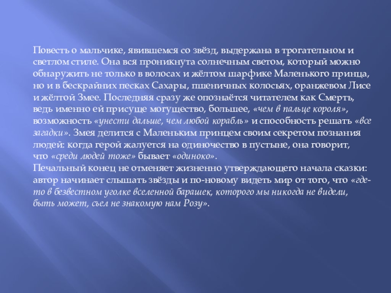 стиле. Она вся проникнута солнечным светом, который можно обнаружить не только в волосах и жёлтом шарфике Маленького принца, но и в бескрайних песках Сахары, пшеничных колосьях, оранжевом Лисе и жёлтой Змее. Последняя сразу же опознаётся читателем как Смерть, ведь именно ей присуще могущество, большее, «чем в пальце короля», возможность «унести дальше, чем любой корабль» и способность решать «все загадки». Змея делится с Маленьким принцем своим секретом познания людей: когда герой жалуется на одиночество в пустыне, она говорит, что «среди людей тоже» бывает «одиноко».