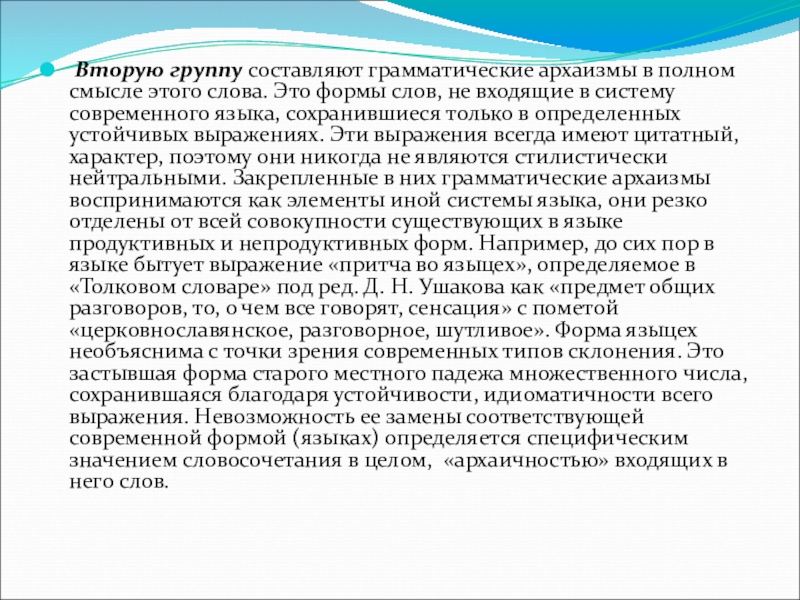 Слайд 16 Вторую группу составляют грамматические архаизмы в полном смысле этого слова.