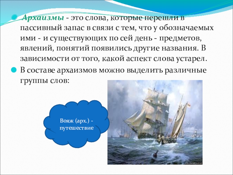 Слайд 8 Архаизмы - это слова, которые перешли в пассивный запас в