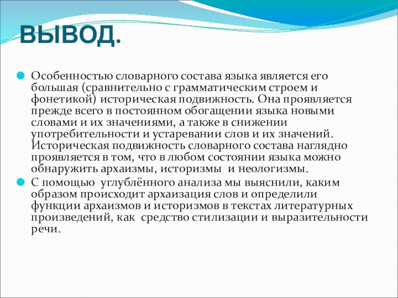 С помощью углублённого анализа мы выяснили, каким образом происходит архаизация слов и определили функции архаизмов и историзмов в текстах литературных произведений, как средство стилизации и выразительности речи.