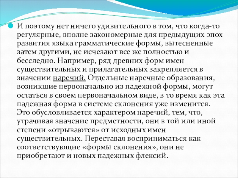 закономерные для предыдущих эпох развития языка грамматические формы, вытесненные затем другими, не исчезают все же полностью и бесследно. Например, ряд древних форм имен существительных и прилагательных закрепляется в значении наречий. Отдельные наречные образования, возникшие первоначально из падежной формы, могут остаться в своем первоначальном виде, в то время как эта падежная форма в системе склонения уже изменится. Это обусловливается характером наречий, тем, что, утрачивая значение предметности, они в той или иной степени «отрываются» от исходных имен существительных. Переставая восприниматься как соответствующие «формы склонения», они не приобретают и новых падежных флексий.