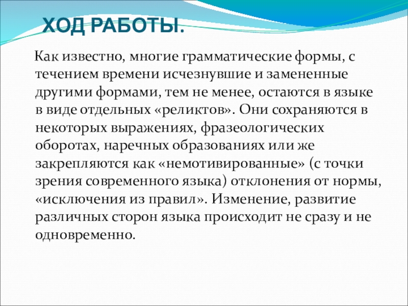 течением времени исчезнувшие и замененные другими формами, тем не менее, остаются в языке в виде отдельных «реликтов». Они сохраняются в некоторых выражениях, фразеологических оборотах, наречных образованиях или же закрепляются как «немотивированные» (с точки зрения современного языка) отклонения от нормы, «исключения из правил». Изменение, развитие различных сторон языка происходит не сразу и не одновременно.