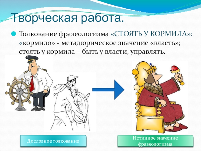Толкование фразеологизма «СТОЯТЬ У КОРМИЛА»: «кормило» - метадюрическое значение «власть»;