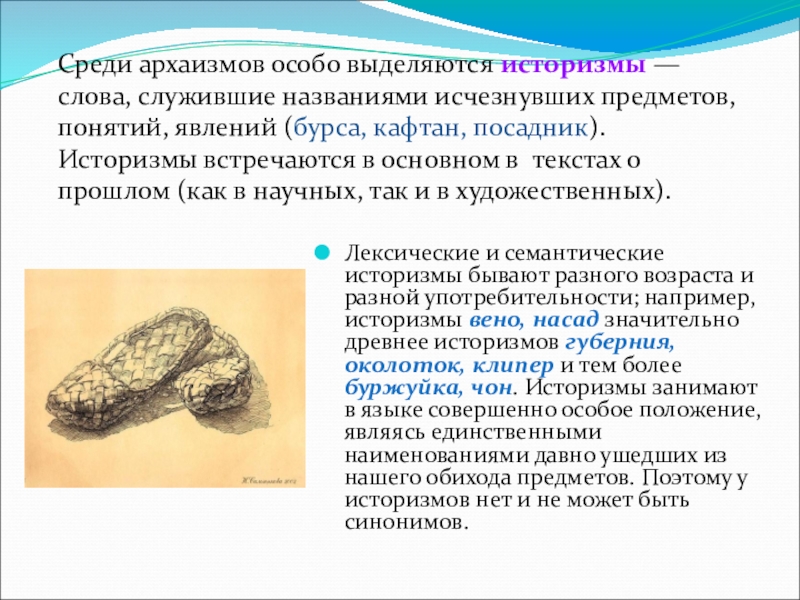 Среди архаизмов особо выделяются историзмы — слова, служившие названиями исчезнувших предметов, понятий, явлений (бурса, кафтан, посадник). Историзмы встречаются в основном в текстах о прошлом (как в научных, так и в художественных).