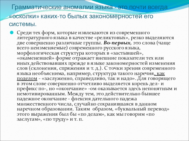 Среди тех форм, которые извлекаются из современного литературного языка в качестве «реликтовых», резко выделяются две совершенно различные группы. Во-первых, это слова (чаще всего неизменяемые) современного русского языка, морфологическая структура которых в «застывшей», «окаменевшей» форме отражает внешние показатели тех или иных действовавших прежде в языке закономерностей изменения слов (склонения, спряжения и т. д.). С точки зрения современного языка необъяснима, например, структура такого наречия, как поделом - «заслуженно, справедливо, так и надо». Для говорящего в этом слове совершенно отчетливо выделяется корень дел- и префикс по-, но «окончание» -ом оказывается здесь непонятным и немотивированным. Между тем, это действительно бывшее падежное окончание - флексия дательного падежа множественного числа, случайно сохранившаяся в данном наречном образовании. Таким образом, «буквальный перевод» этого выражения был бы «по делам», как мы говорим «по заслугам», «по труду» и т. п.