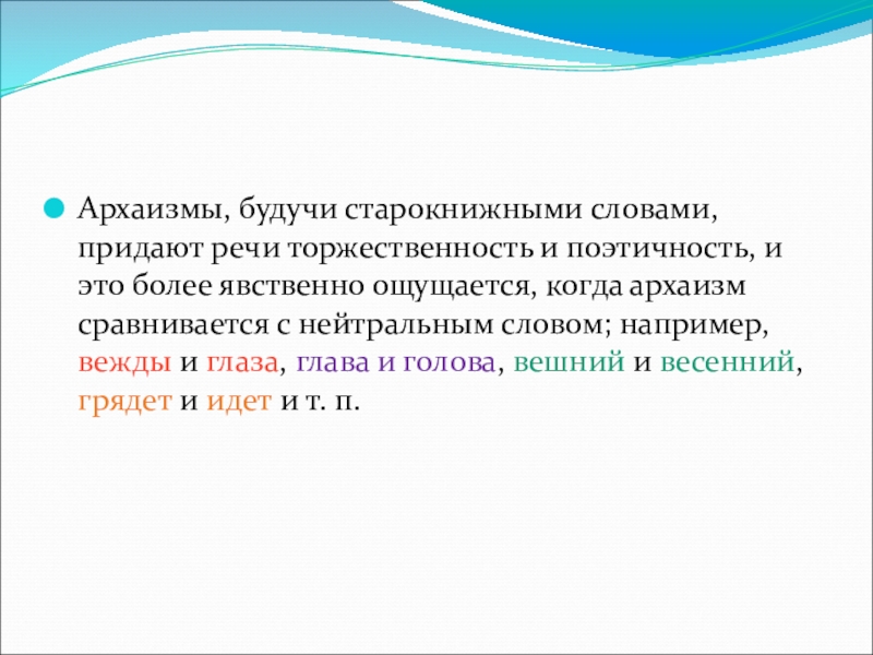 более явственно ощущается, когда архаизм сравнивается с нейтральным словом; например, вежды и глаза, глава и голова, вешний и весенний, грядет и идет и т. п.