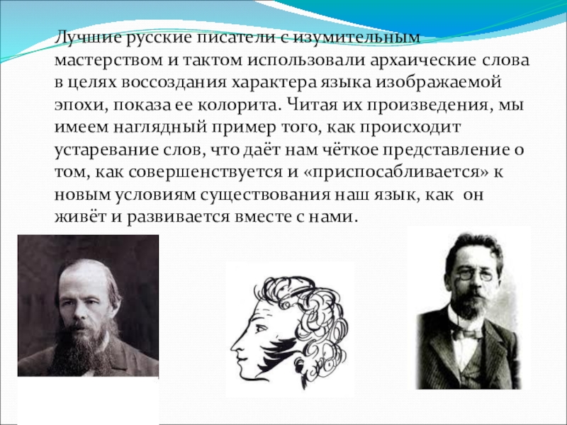 Слайд 13Лучшие русские писатели с изумительным мастерством и тактом использовали архаические слова