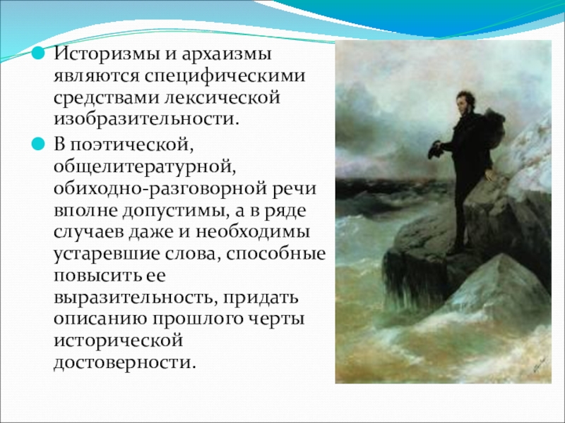 речи вполне допустимы, а в ряде случаев даже и необходимы устаревшие слова, способные повысить ее выразительность, придать описанию прошлого черты исторической достоверности.