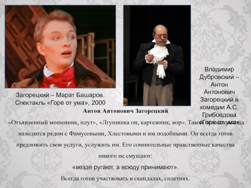 Владимир Дубровский – Антон Антонович Загорецкий в комедии А.С.Грибоедова «Горе от ума»