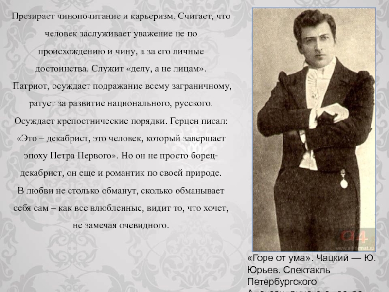 «Горе от ума». Чацкий — Ю. Юрьев. Спектакль Петербургского Александринского театра. Фото конца XIX — начала XX в.