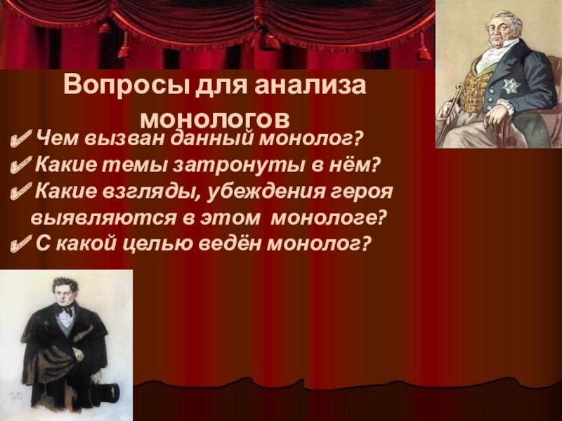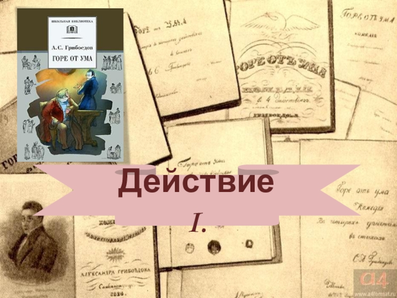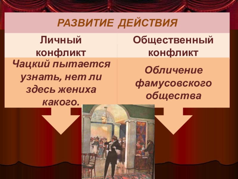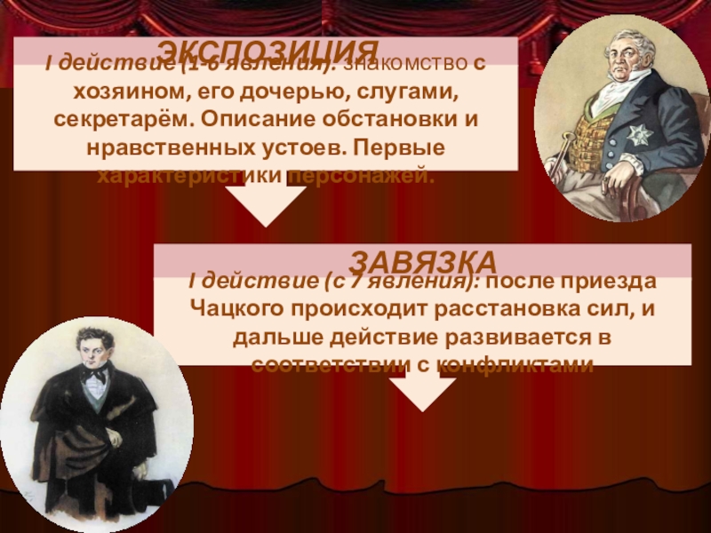 I действие (с 7 явления): после приезда Чацкого происходит расстановка сил, и дальше действие развивается в соответствии с конфликтами