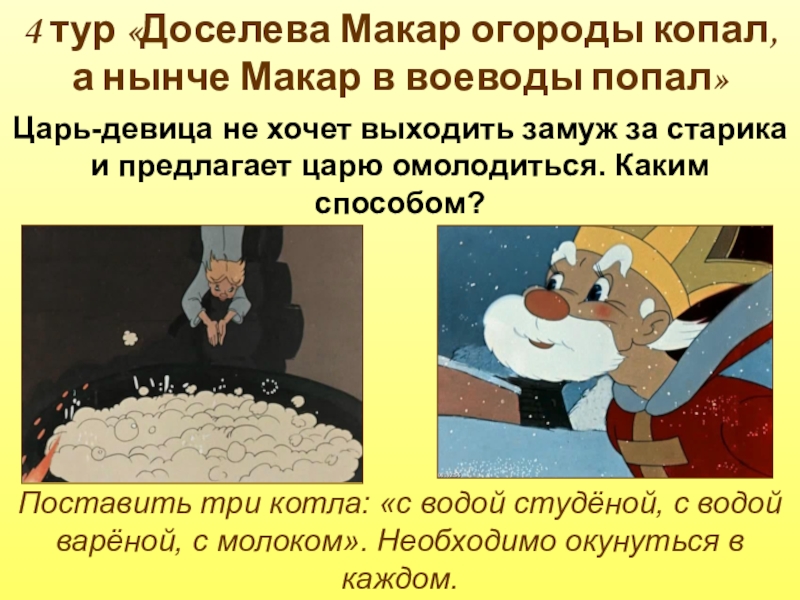 Поставить три котла: «с водой студёной, с водой варёной, с молоком». Необходимо окунуться в каждом.