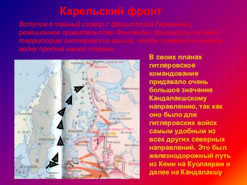 В своих планах гитлеровское командование придавало очень большое значение Кандалакшскому направлению, так как оно было для гитлеровских войск самым удобным из всех других северных направлений. Это был железнодорожный путь из Кеми на Куолаярви и далее на Кандалакшу.