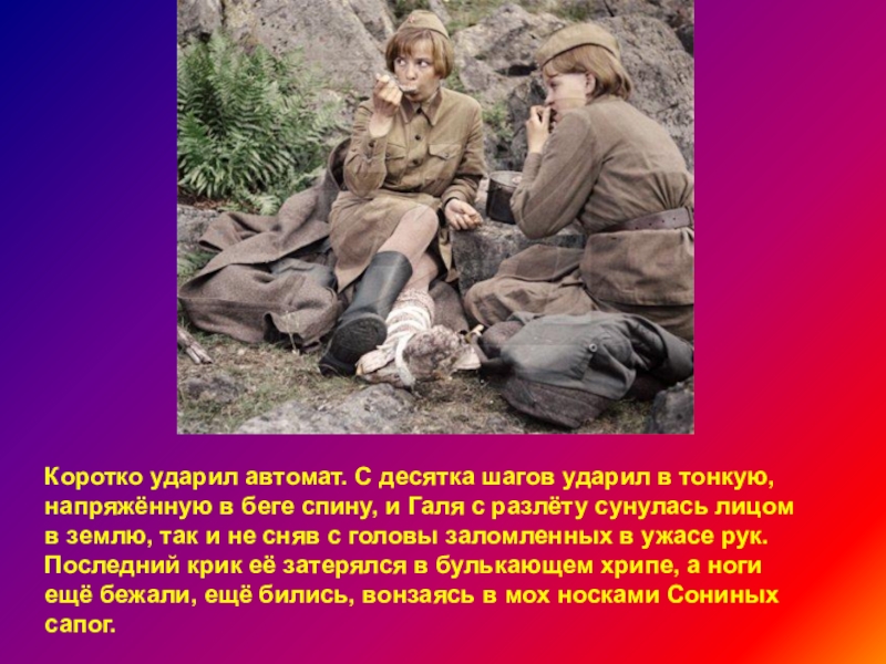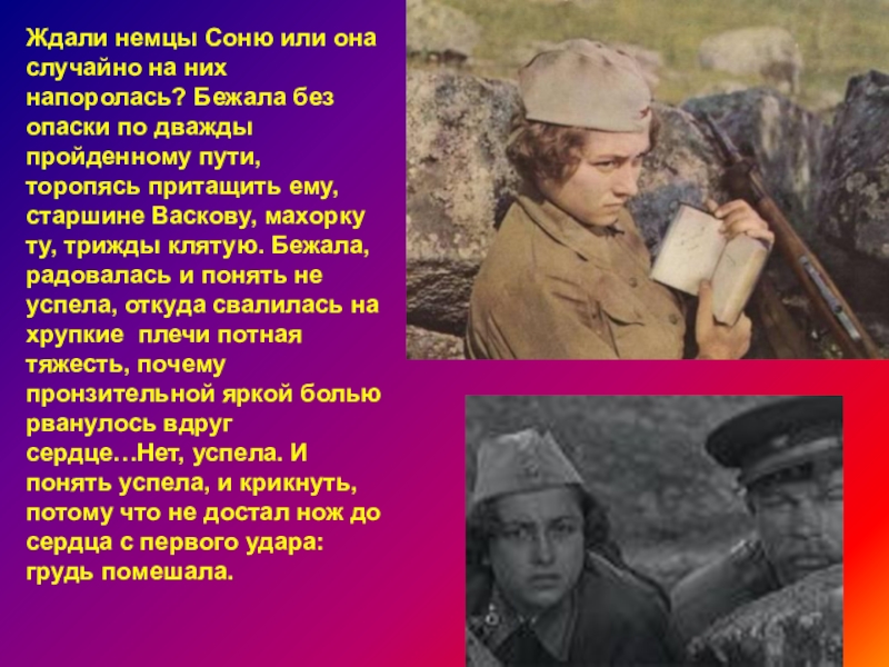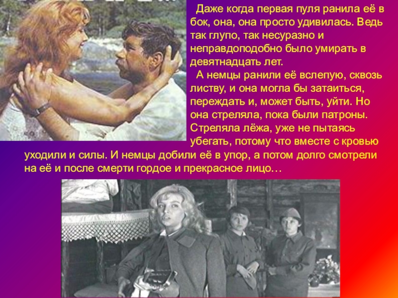 уходили и силы. И немцы добили её в упор, а потом долго смотрели на её и после смерти гордое и прекрасное лицо…