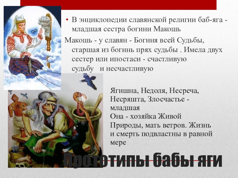 Слайд 11В энциклопедии славянской религии баб-яга -младшая сестра богини Макошь